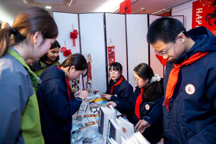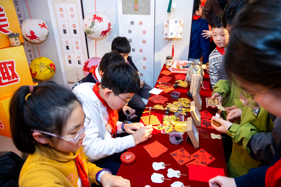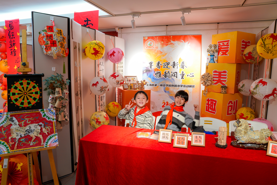 美术项目“一条龙”布局校带来的互动体验更是妙趣横生。上海市育才中学将一盏盏折叠纸灯笼高悬于展区,灯面绘有剪纸风格的喜气奔马,紧扣迎新主题;上海市第六十中学则把丝网版画与春节贴“福”习俗巧妙结合,观众可近距离观看马形福字的印制过程,并题写新年寄语,带走一份独一无二的年礼。逸夫职业学校另辟蹊径,将书法篆刻与非遗、文创相结合,在马克杯上嵌入数字媒体技术,“扫一扫”即可开启线上交互体验,让传统文化在日常中焕发新生。